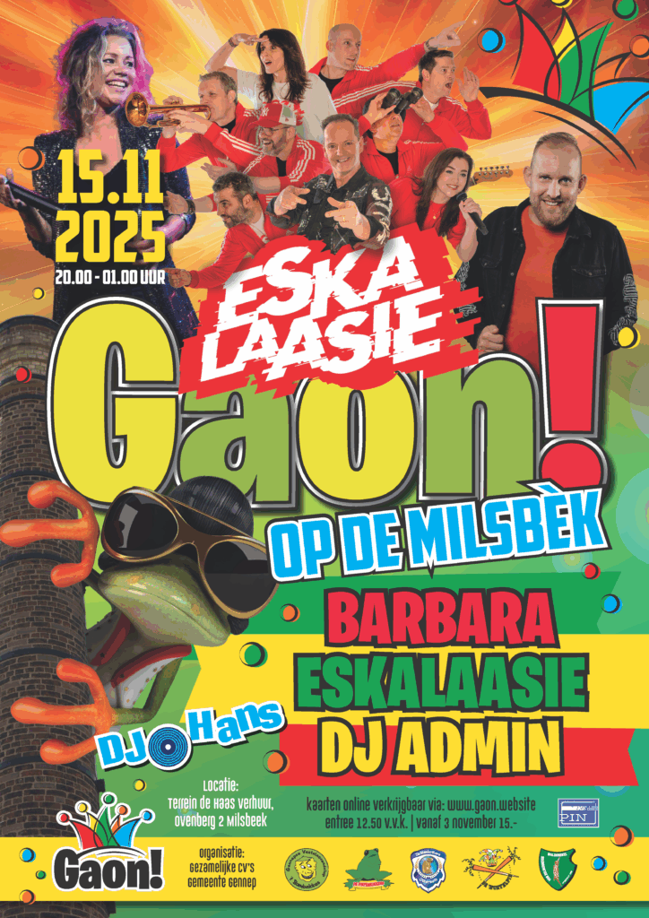 Op 15 November Gaon! we met zijn allen naar de feesttent op de Milsbèk. Hier organiseren de gezamenlijke carnavalsverenigingen van de gemeente Gennep een fantastisch feest voor jong en oud.